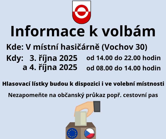 Volby do poslanecké sněmovny se uskuteční v pátek a v sobotu 3. a 4. října v místní hasičárně (Vochov 30)